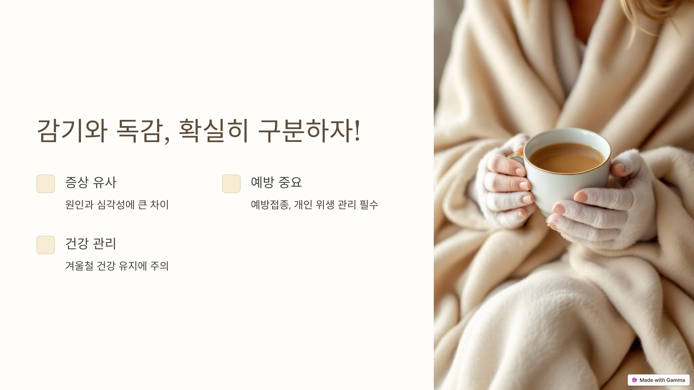 갑작스러운 고열과 근육통이 있다면 독감을 의심하세요. 감기는 보통 미열이나 열이 없는 경우가 많습니다.