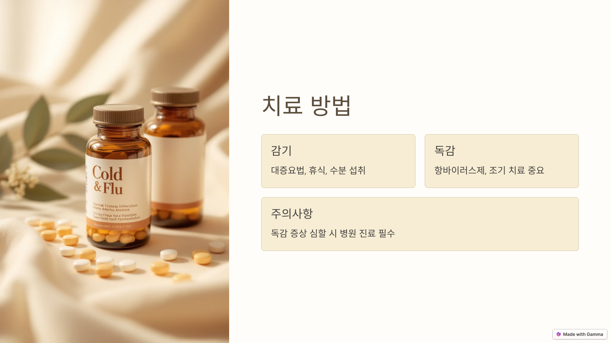 감기는 자연 치유가 가능하지만, 독감은 조기 치료가 중요합니다. 증상이 심할 경우 병원 진료를 받는 것이 필수입니다.
