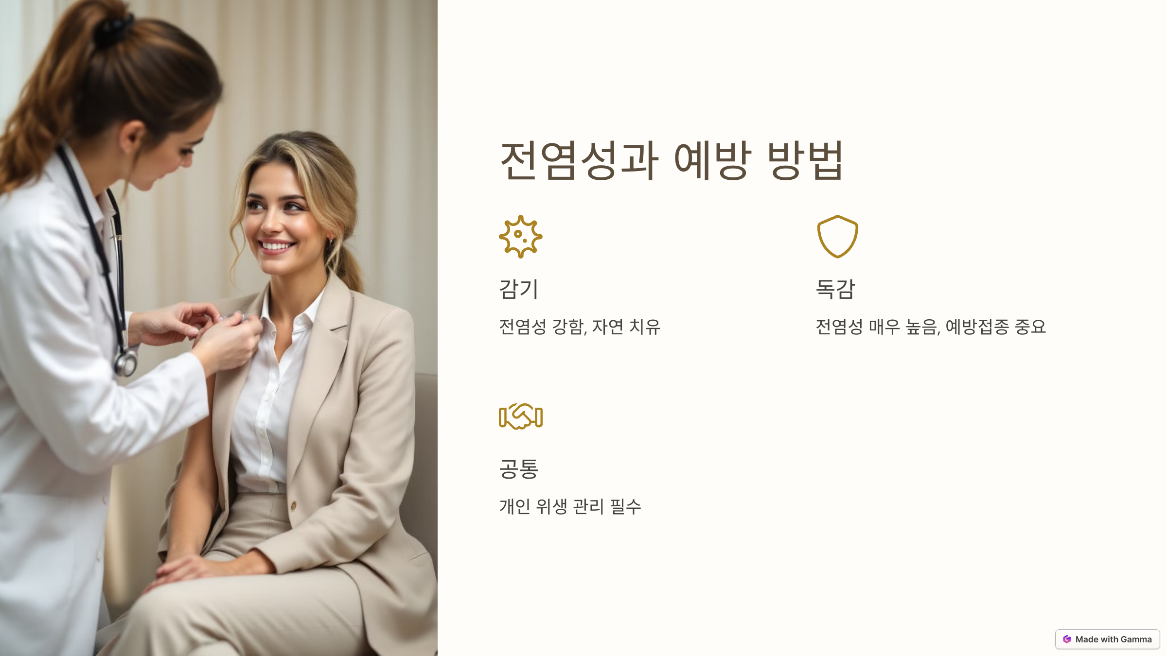 - 감기: 전염성이 강하지만, 증상이 경미해 대부분 자연 치유됩니다. 손 씻기와 개인 위생 관리가 중요합니다.