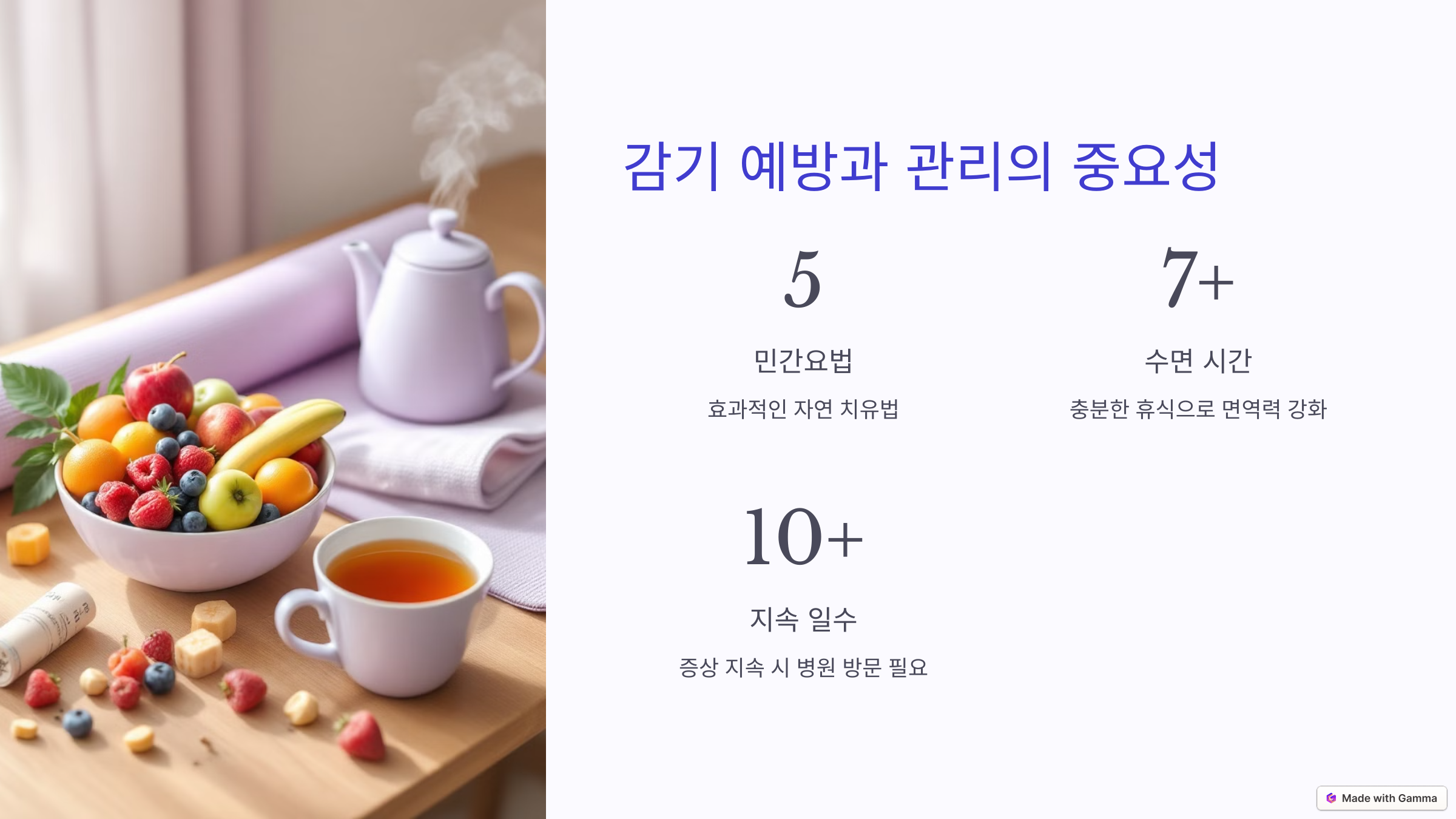 감기는 자연스러운 치유 과정을 통해 회복되지만, 위의 민간요법을 활용하면 회복 속도를 높이고 증상을 줄일 수 있습니다. 또한, 면역력을 꾸준히 관리하여 감기에 잘 걸리지 않는 건강한 몸을 유지하세요! 😊