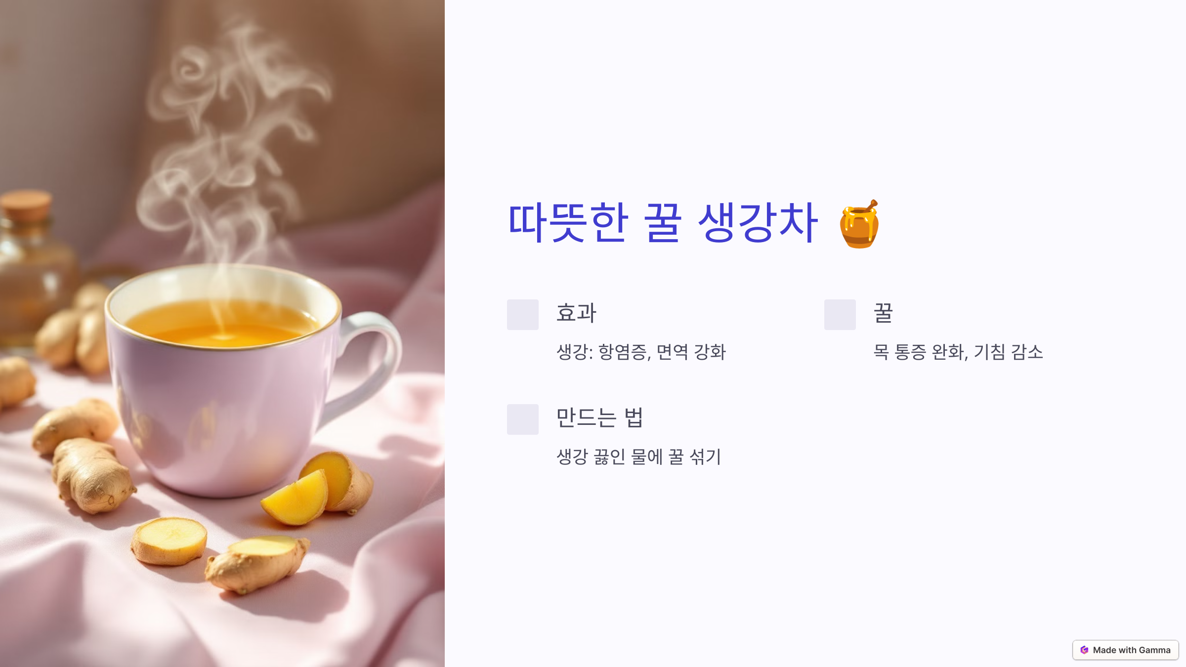 1. 따뜻한 꿀 생강차 🍯
