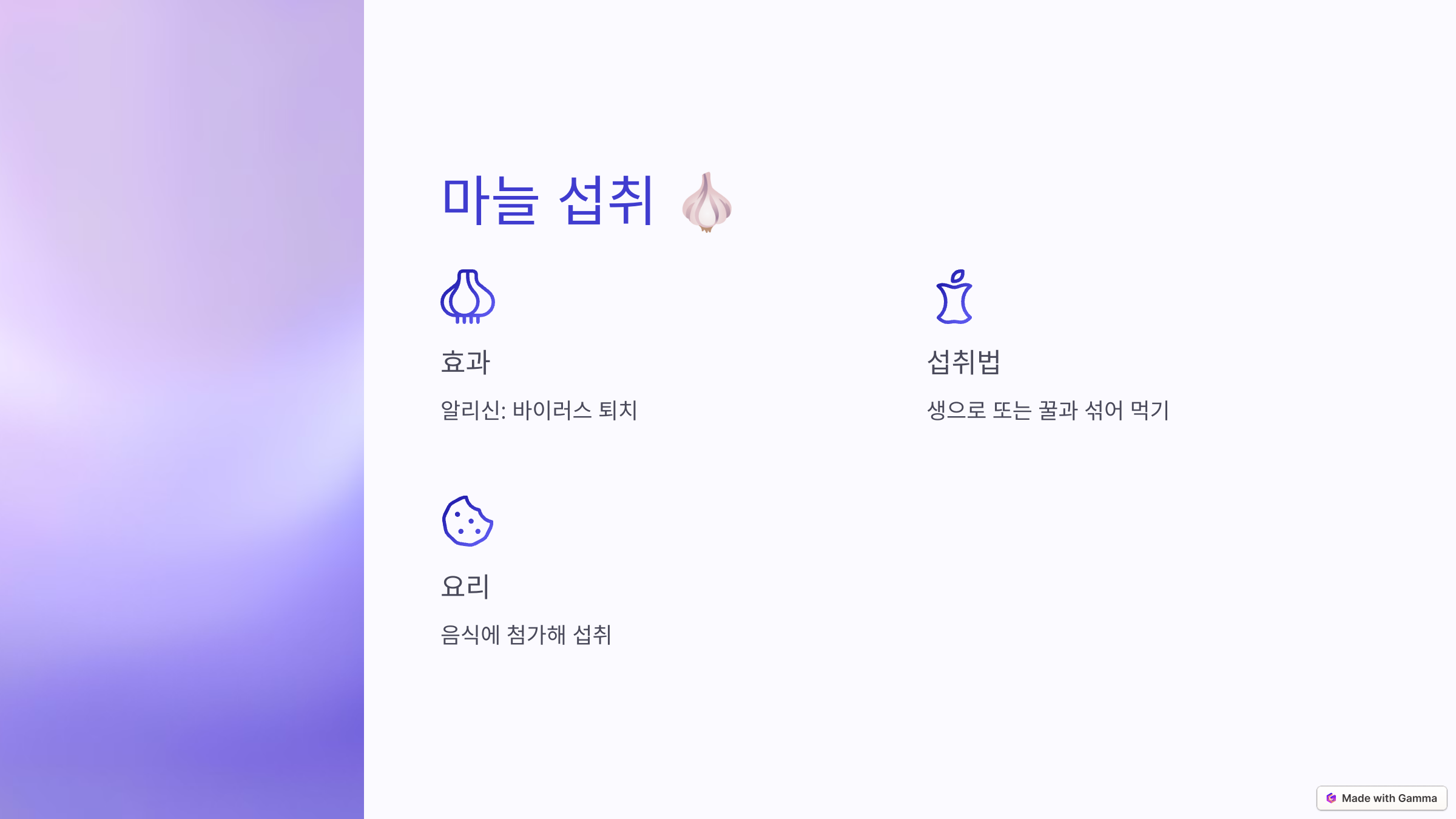 - 마늘 속 알리신 성분이 바이러스 퇴치에 도움을 줍니다.