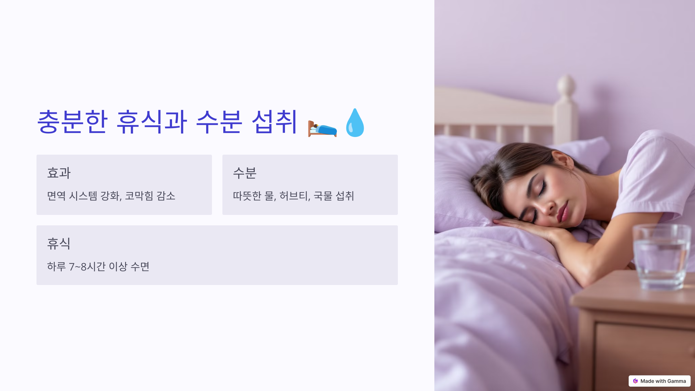 - 수분 섭취는 점액을 묽게 만들어 코막힘을 줄이고, 목의 건조함을 완화합니다.