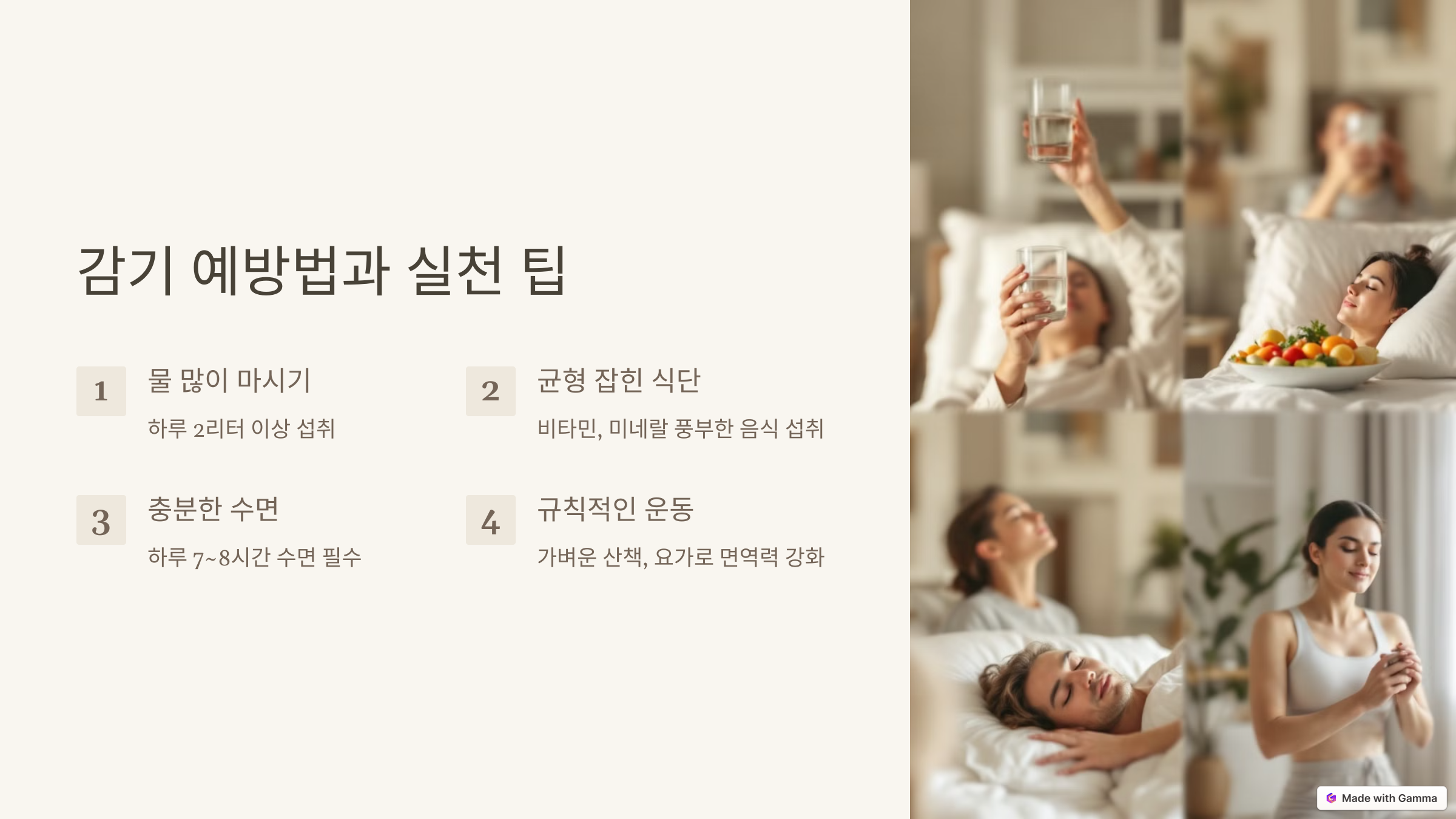충분한 수분 섭취는 몸의 면역력을 강화시키고, 호흡기의 점막을 촉촉하게 유지해 감염을 막아줍니다. 하루 2리터 이상의 물을 꾸준히 섭취하세요.